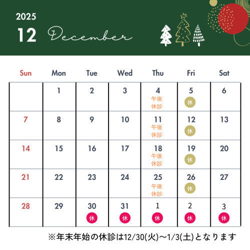 年末年始は12/30(火)~1/3(土)までの5日間、終日休診とさせていただきます。